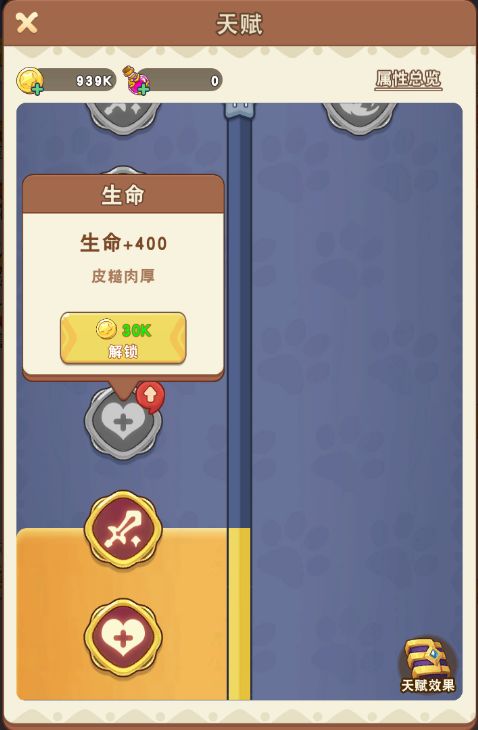 在等级达到2级后,可以开启天赋功能。在天赋里,我们可以通过消耗金币和强大药剂永久提升战斗属性,达到一定等级后还可以解锁特殊的天赋效果。