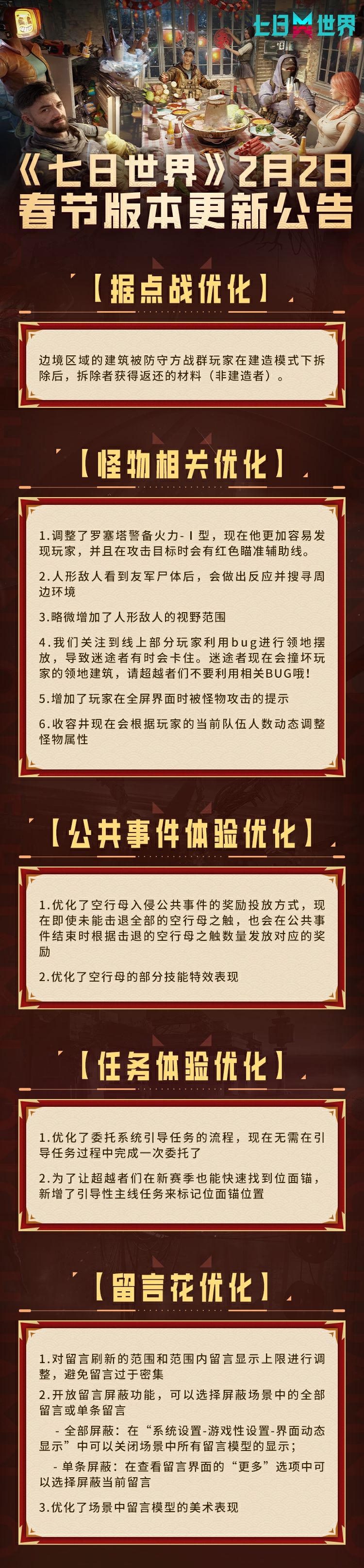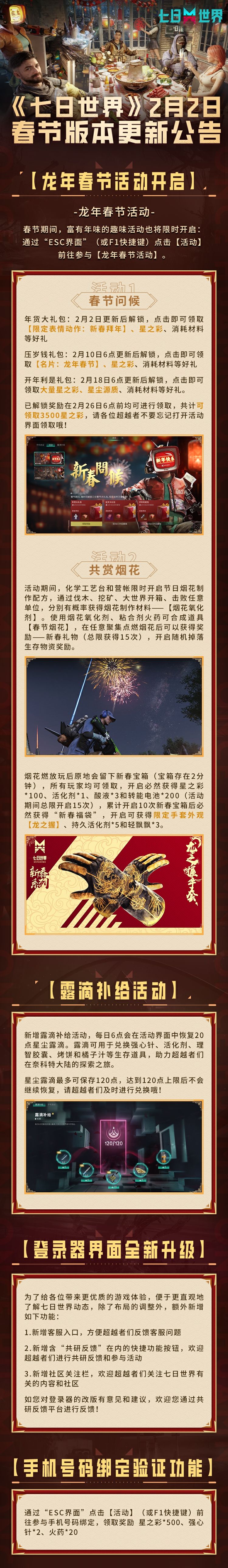 我们预计在2月2日 8:00 ~ 10:00 进行更新维护,更新完成后,《七日世界》春节版本更新将于2月2日和大家正式见面!开发组在此真诚祝愿大家:龙年大吉,万象启新!