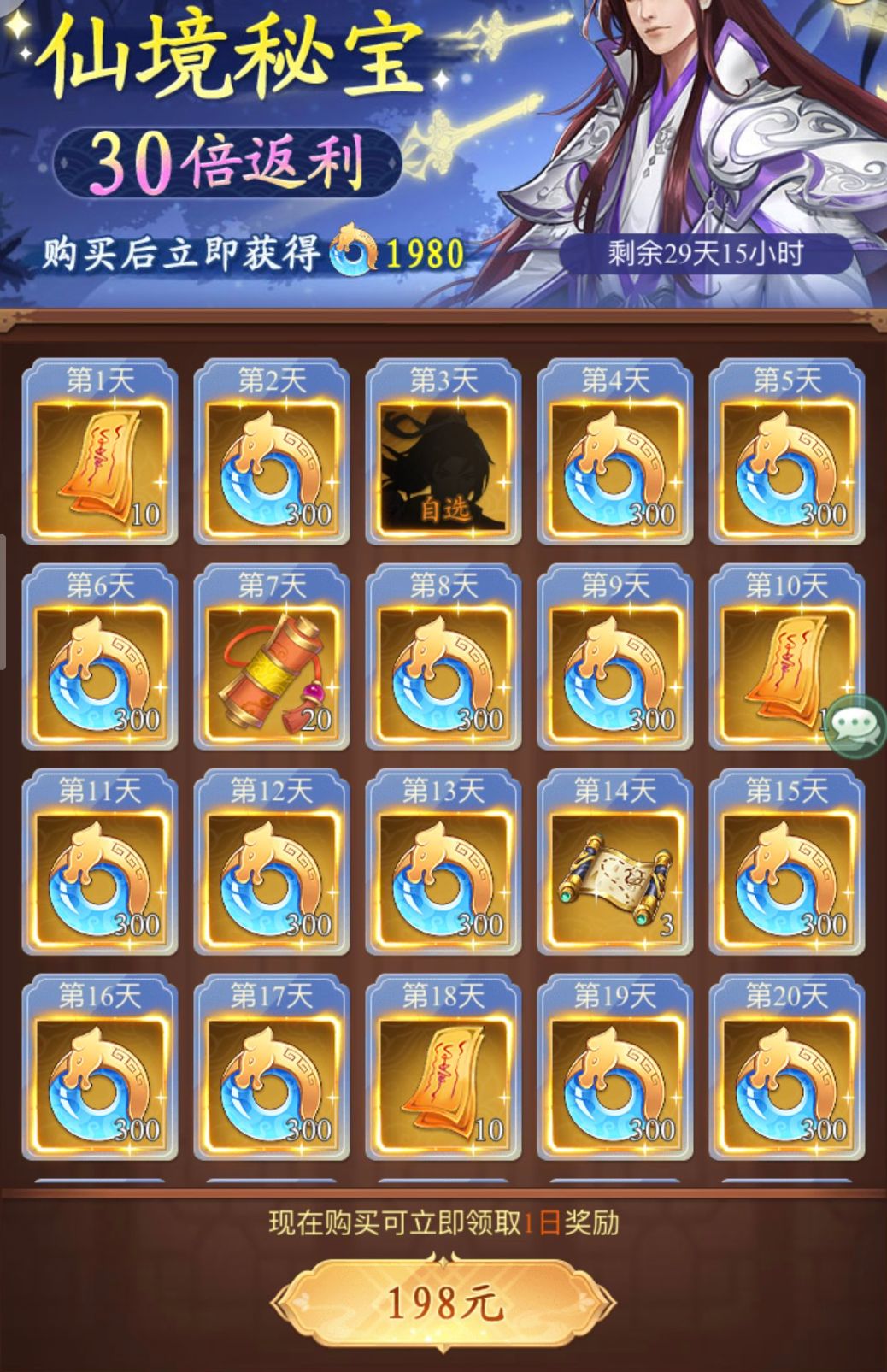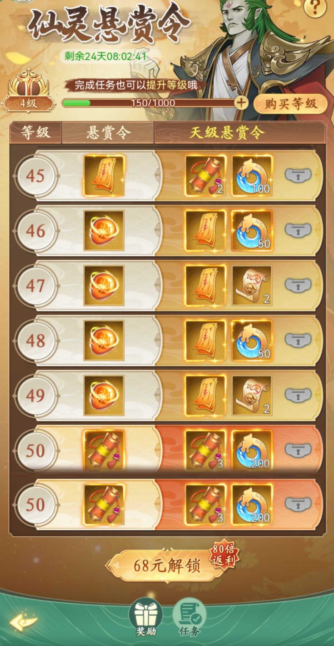 推荐理由:里面都是一些非常简单的任务,规定时间能轻松完成,50满级后可获得40个通灵符、20个红尘契、2000灵玉,物有所值,超划算,小氪微氪可买