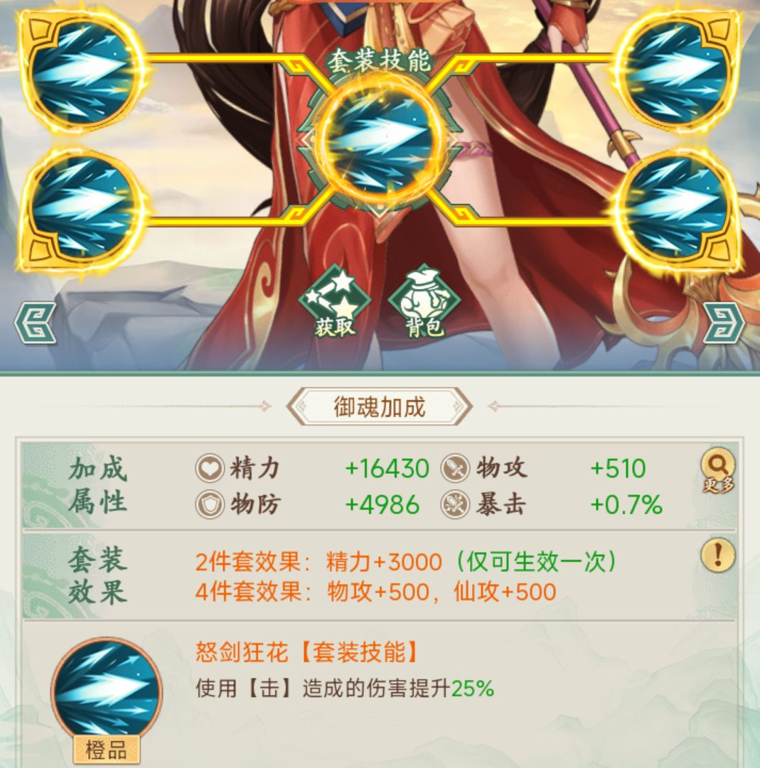 ①战意勃发 适用于利用大招造成伤害的伙伴,金色御魂可增加25%的绝技伤害,推荐伙伴剑圣、紫萱、沈欺霜等