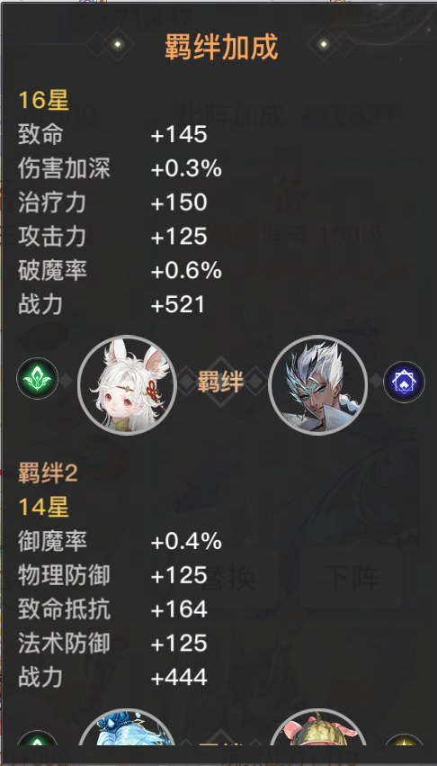 3、元素羁绊分为攻击、防御两种羁绊。结伴双方不处于同一元素大类时,形成攻击羁绊,带来攻击、致命、破魔率、伤害加深等属性加成;结伴双方处于同一元素大类时,形成防御羁绊,带来防御、致命抵抗、御魔率、伤害减免等属性加成。(小谕温馨提示:水火雷为同一大类,光暗灵为同一大类,原力英灵始终形成攻击羁绊)