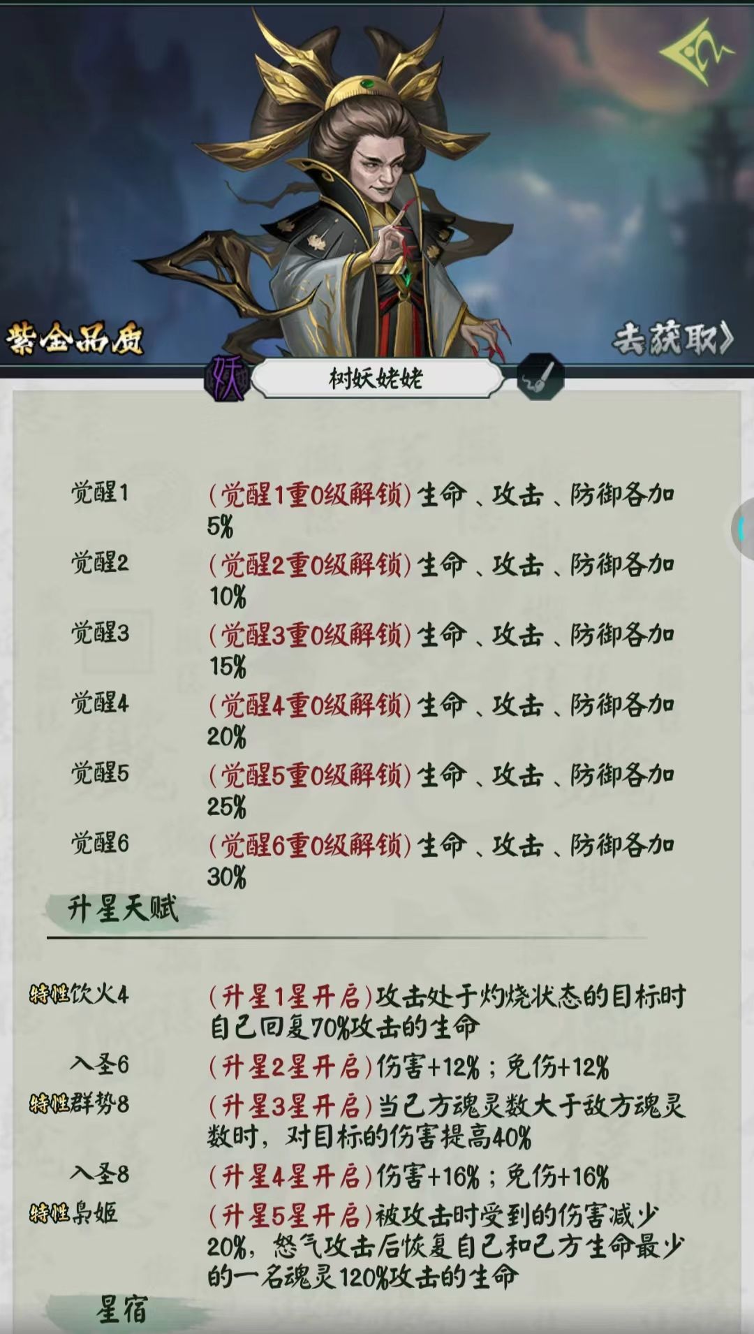 幻彩2九尾是妖族主C担当,全新改动后的九尾获得了加血神技和魅惑技能(禁普攻/怒攻/回血/回怒特性),但是她的怒攻是打两条直线4个人,基础伤害有点低所以需要想办法触发1星天赋(如下图)的暴击,她本身是没有技能挂灼烧,这个时候就需要其他魂灵的配合了,石矶或者龙女可以放在1号位先手挂上灼烧再由九尾暴击输出接上控制,幻彩宠物2兔子+灵符寒天的搭配也能极大程度上提升伤害;主九尾副石矶+龙女应该是当前版本妖族最强阵容了,白骨夫人和黑山老妖也能为阵容提供增益。