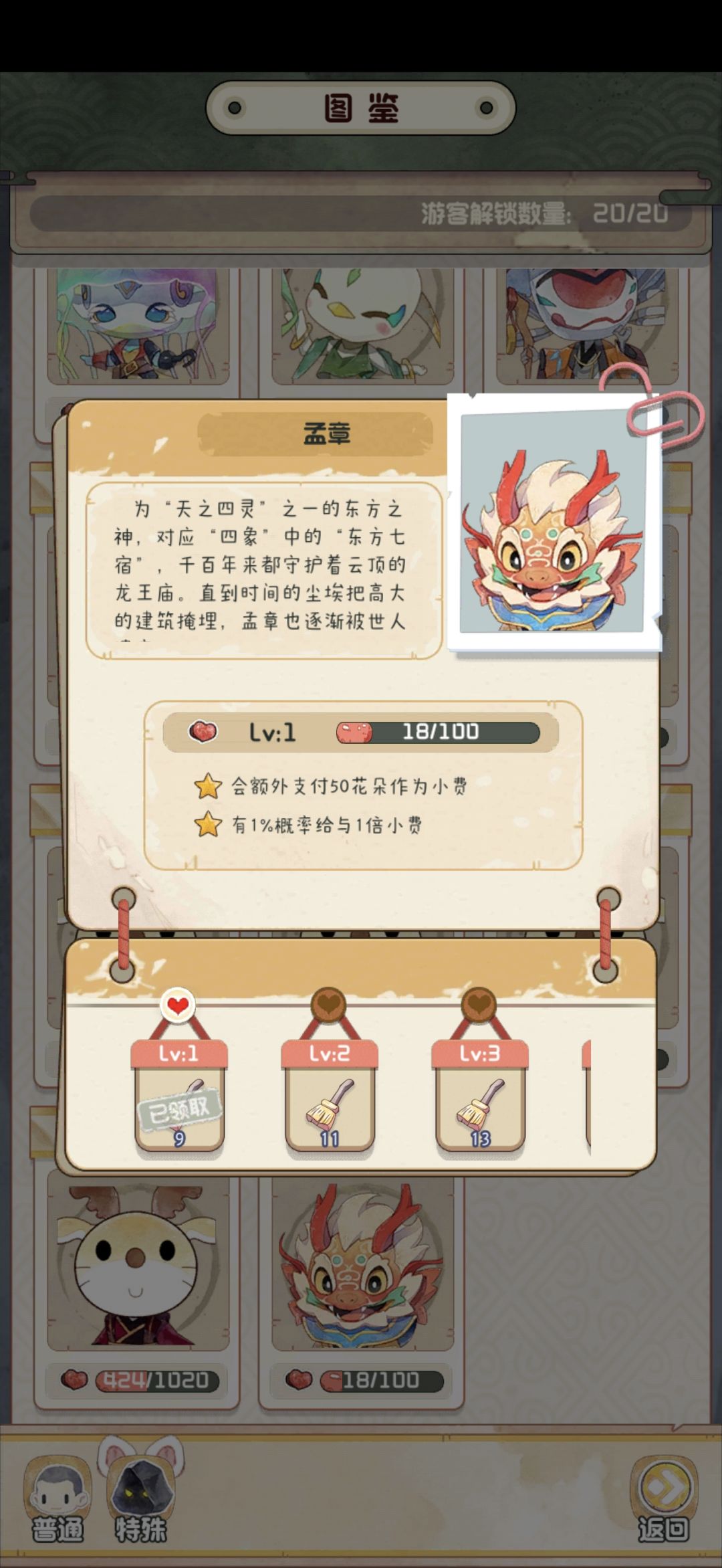 共五级,分别是9,11,13,15,17,一共65个扫把。但是点过这么多次游客的我们很清楚,虽然说看起来这个小孟的出现概率不低,但是点满五级还是很有难度的。最近基本上要把体力分配到橙色小恐龙上了。有条件的馆长在活动期间不推荐使用游客机器人,因为机器人是不会管你什么颜色恐龙的,他只管清体力。