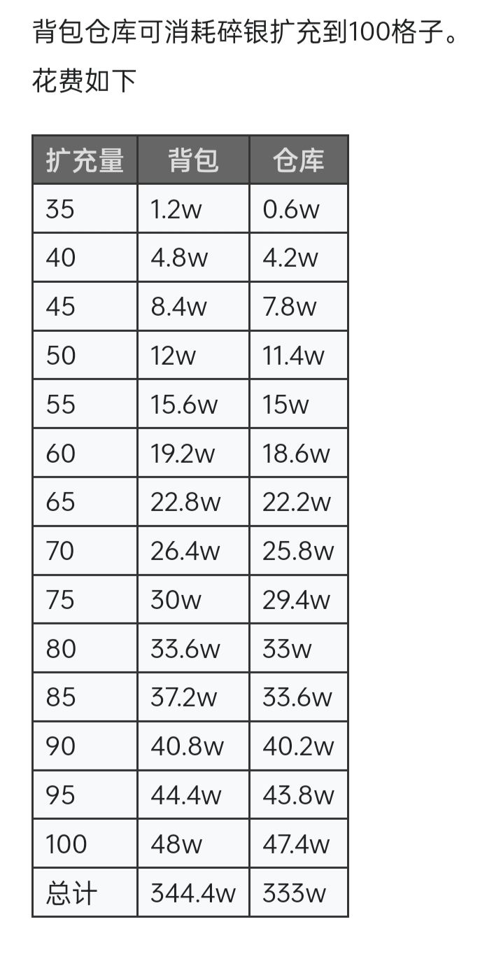 2024-1-31更新 背包仓库扩容总消耗表
