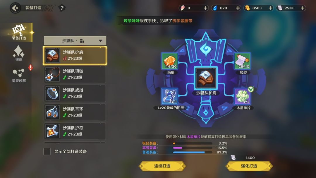 - 当你有了足够的材料后,就可以在装备打造页面开始制造装备