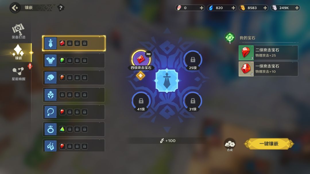 - 界面中可以进行快捷提升,一键镶嵌,宝石合成等便捷操作