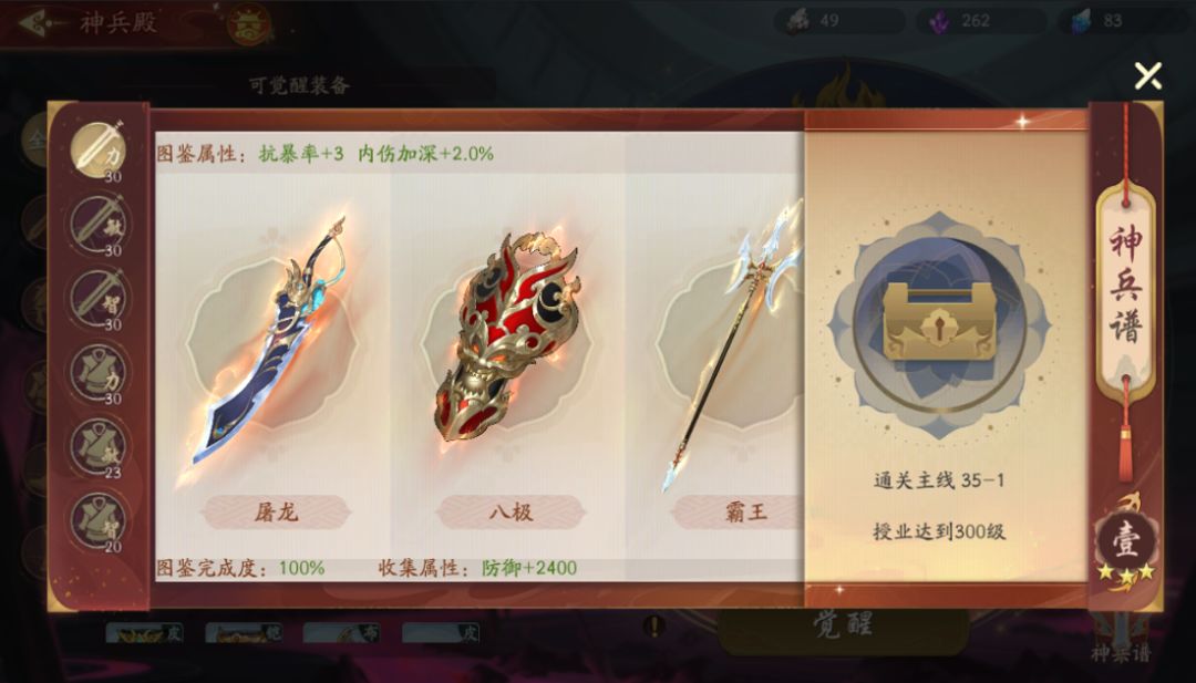 觉醒神兵后,神兵谱对应的神兵将被激活,并获得全局属性加成,不同神兵收集的越多,带来的属性加成越多。