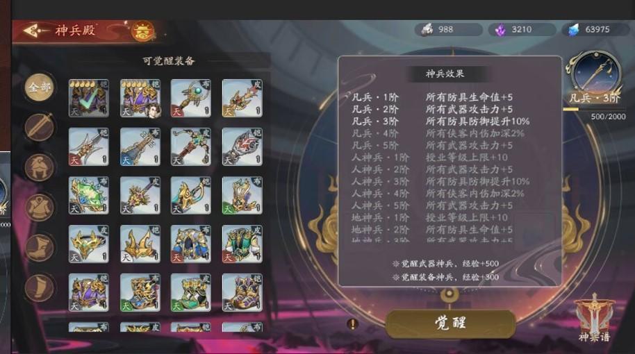 2、装备装备觉醒:装备觉醒后将变化为神兵,要觉醒的装备必须满足“强化至满级”“突破到天阶”“词缀属性至少全部是紫色以上”这三点;