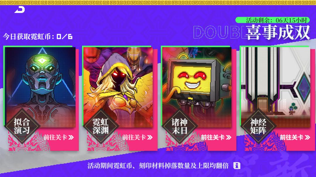 比如说,之前霓虹币击杀boss概率爆一个,现在击杀boss后概率爆两个,刻印材料同理,同时获取上限翻倍,之前最多3个,现在最多6个