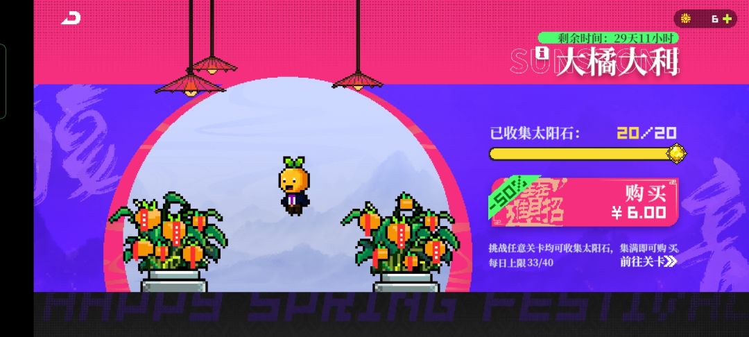 也是一个充值活动,采用了肝+氪的形式,关卡中可以获得虚拟太阳石,虚拟太阳石可以累积在橘宝这里,累积满后可以通过氪金的方式带走