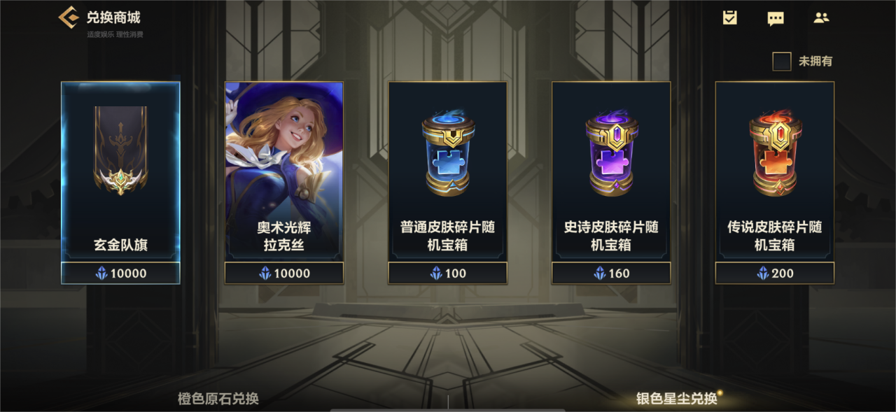 换取了足够的银色星尘后,可在【银色星尘兑换】一栏,消耗相应个数的银色星尘,兑换奥术光辉 拉克丝、普通/史诗/传说皮肤碎片随机宝箱。想要传说皮肤的召唤师,可以使用银色星尘*200换取传说皮肤碎片随机宝箱。
