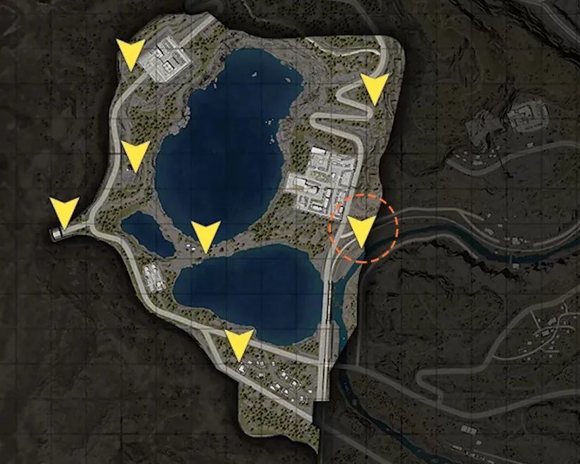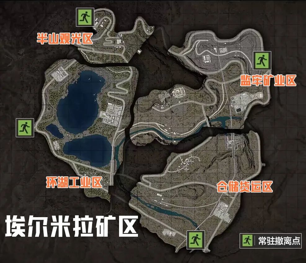地图的常驻撤离点只有四个,分别是位于半山观光区缆车站里的停机坪(5号),位于监牢矿业区1号矿东侧的1号矿打卡点(10号),和位于环湖工业区西侧公路尽头的隧道入口(13号),以及位于仓储货运区东南角的通往马尔洛斯之路(15号)。这四个撤离点均为开局可见,而其他的撤离点则需要开局15分钟后才有概率开启。