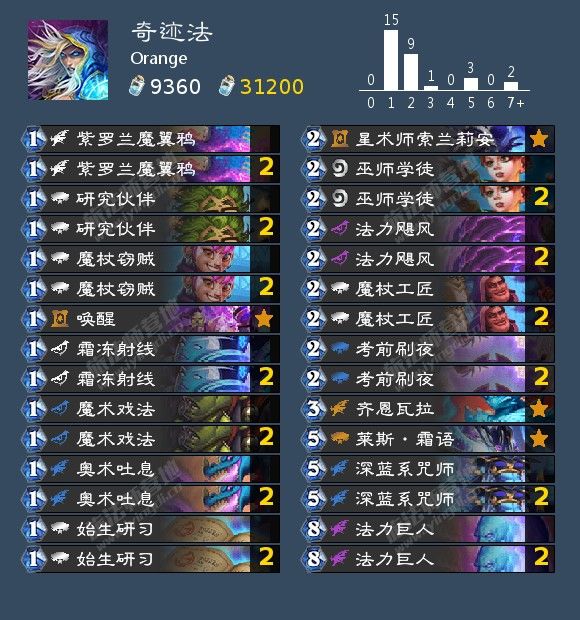 在当前环境奇迹法是当之无愧的T1卡组,核心思路是通过各种衍生牌快速让巨人减费,靠88的压场获胜(获胜方式还包括法力飓风或者唤醒开出的法术,终极随从耍赖赢)。Orange这套牌就是秉承获得衍生牌快速减费巨人的思路优化卡组的,卡组带上了魔杖工匠+深蓝系咒师的组合。这是一个经常在控制恶魔猎手或者牧师卡组里经常看到的组合,但是当前法师的一费法术牌整体质量也非常高。(随机出冰片,唤醒都可以快速给巨人减费)因为有这两张单卡,巫师学徒的启动会变得更顺滑,镜像和冰冻智慧也是打快攻时非常好用的单卡,且更容易获得一费法术在你后手有巫师学徒和齐恩瓦拉可以打出爆炸的上限(我今天五费出了三个55)。这套牌还有一个亮点就是一费的奥术吐息,我自己打得时候经常用这张牌“套娃”(有巫师学徒的时候,吐息发现唤醒再随机到冰片,经常四五费就扔一个1费甚至0费的巨人到场上了)一般吐息是和深蓝系咒师或者始生研习里的碧蓝龙探险者配合,很多时候就算没有发现特效也是一张不错的前期解牌。