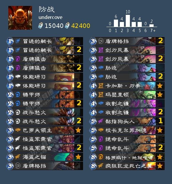 来自营地老挨打防战玩家undercover的一套防战。防战本身是一个比较吃环境的卡组,打骑士、法师、动物园、DH和德都有优势,打盗贼的话五五开,只有打牧师大劣势几乎没有赢面。防战是比较吃熟练度的卡组,以下对部分对局做简要介绍: