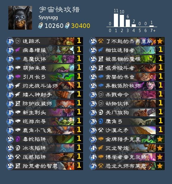 术士:通常是黑眼园,大优,只要艇长+怒火中烧过一波牌把解牌攥在手里就赢了,无论是乱斗还是艇长+巴罗夫领主或者玛瑟里顿+镰刀的combo都可以清掉全场,动物园的随从并没有那么多。