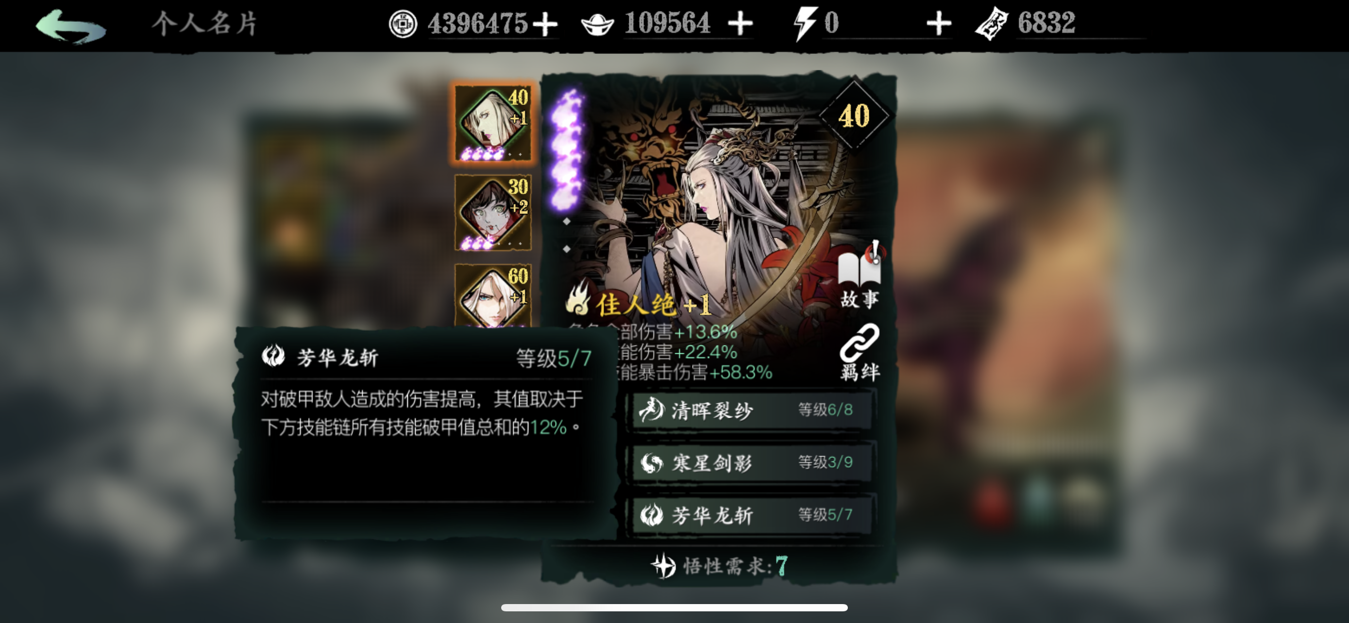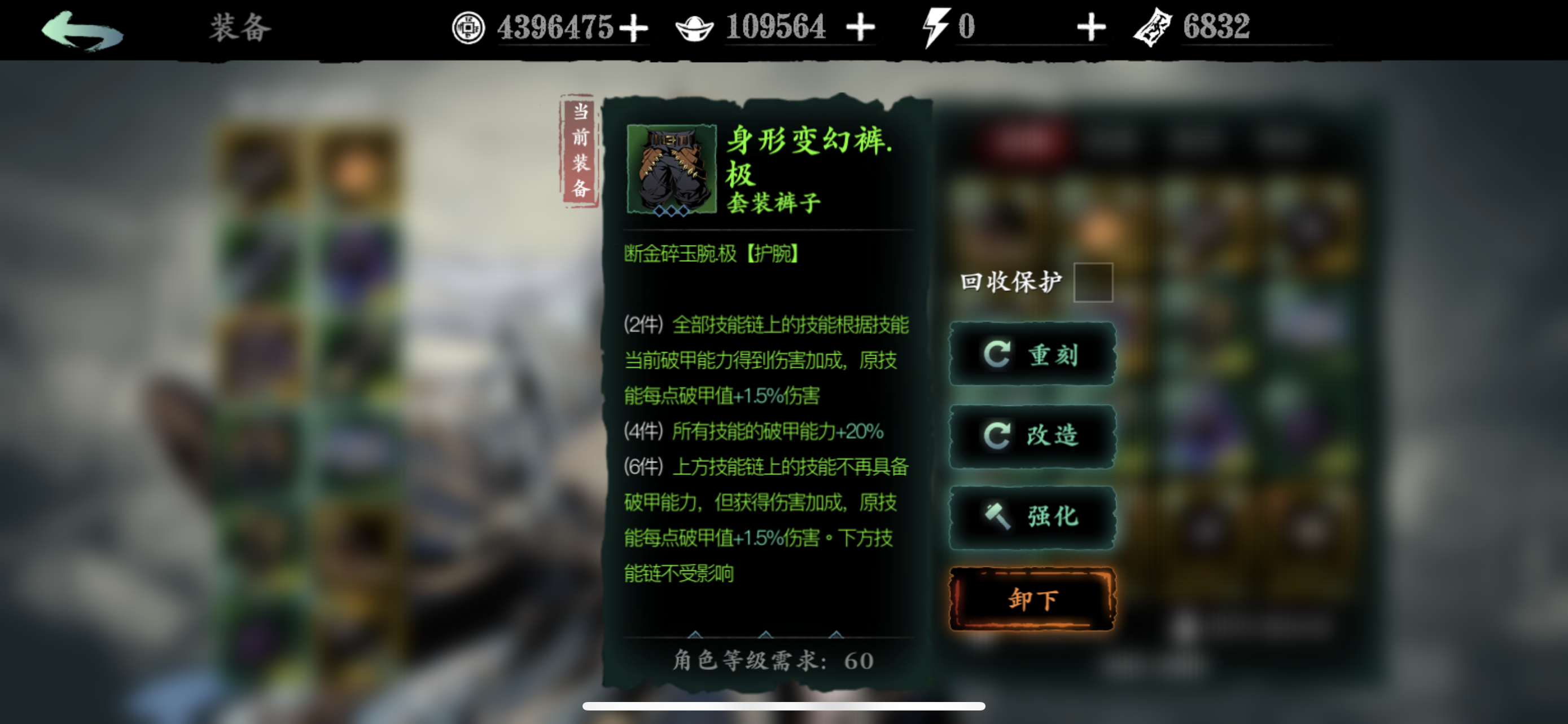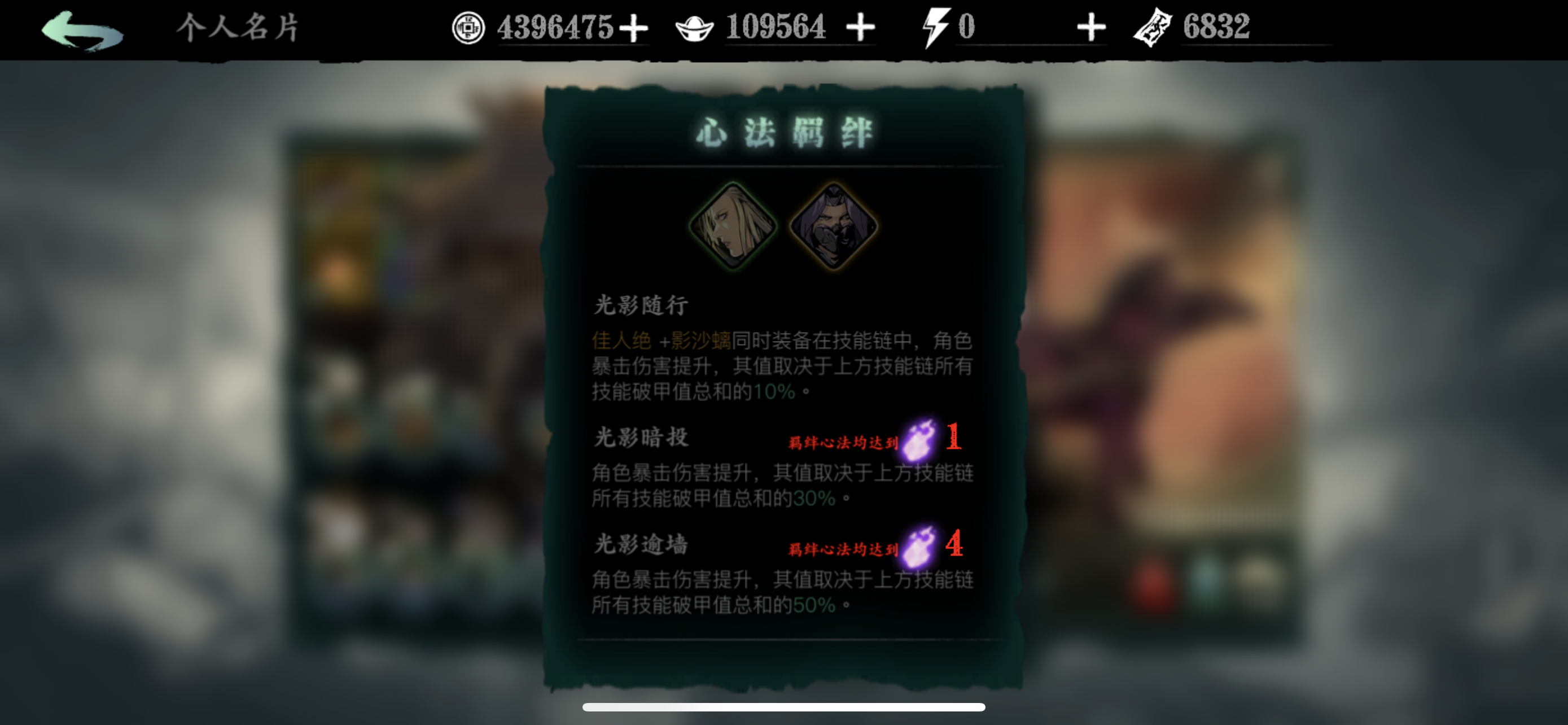 3⃣️爆伤羁绊,我自己号在穿了铁君子的情况下的上链(下图有链子)破甲值大概在700左右(无龙二绝技1加成),紫一羁绊的龙二应该可以给我加200%多的爆伤,好是好,但是本人没玉面蛇行(悲