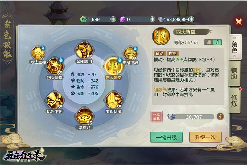 这里主要说一下PK的思路,一般情况下,道场竞技时,优先封印对方法师单位,因为灵山被法术伤害克制严重,封印住对方法师单位,可以有效提升自己的存活率,被封印的目标不要去集火,转打对方物理职业,一般情况下可以用紧箍咒试探对方整体抗封水平,决定是否超爆气四大皆空。