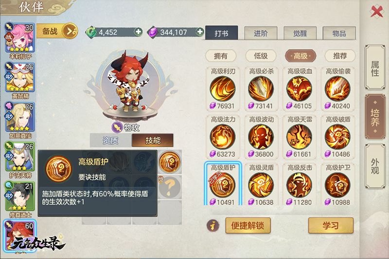 伙伴的话,搭配比较多元化,有神兽肯定用神兽,没有神兽其实可以使用杨戬和蚩尤,增强单人PVE模式的作战能力。(蚩尤搭配高级盾护,可以增加一次护盾回合数!)