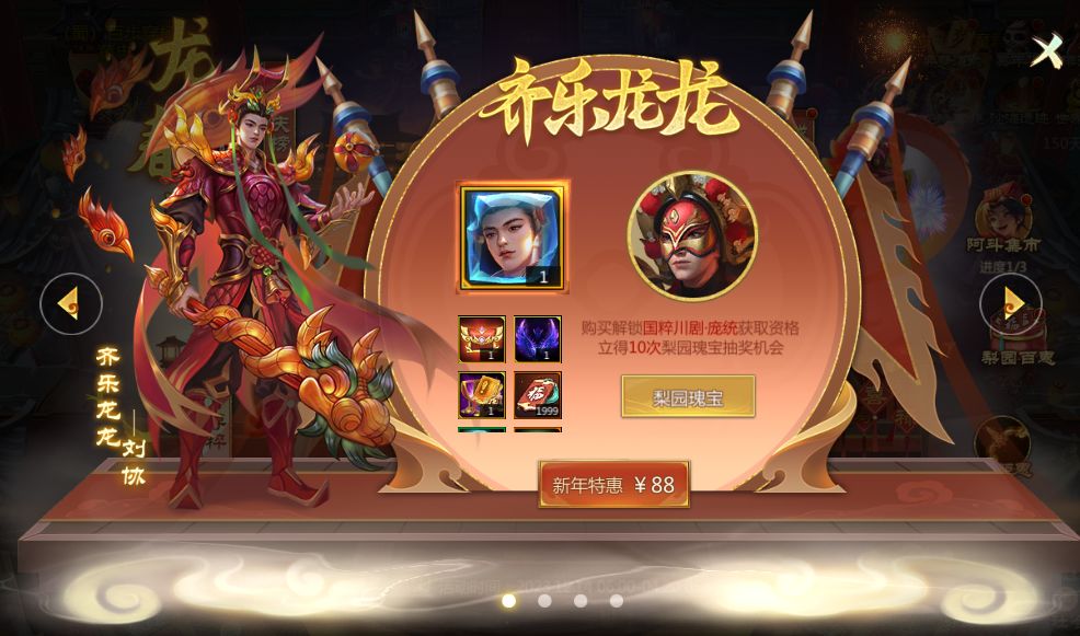 除了礼包本身外,获取【齐乐龙龙】还可解锁梨园瑰宝活动内梨园额外奖励——国粹川剧·庞统的获取资格。同时,可立得10次梨园瑰宝抽奖机会。