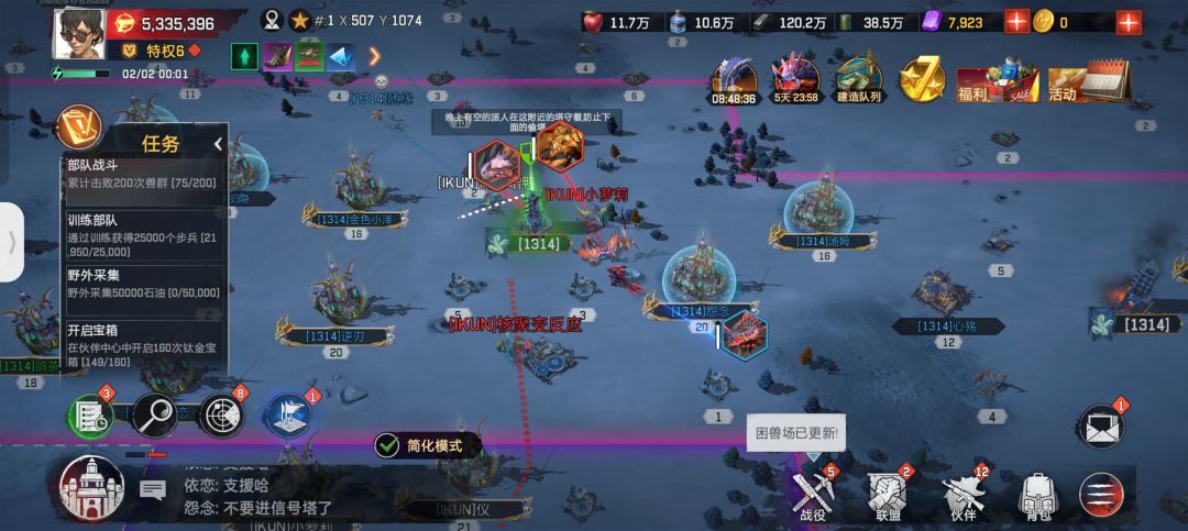 其次,这个游戏两盟开战是需要“信号塔”这一建筑相互接壤的,两个联盟不接壤的话就无法开打,这就已经限制了其他盟插手,但现在两个距离很远的不同盟的成员可以直接通过“退盟——加盟”这一短短几秒钟的操作,达到无需将自己盟的建筑与敌盟领地接壤就能攻打敌盟的效果,是不是有点超了?明明需要修很久很久的路现在一秒钟完事了。
