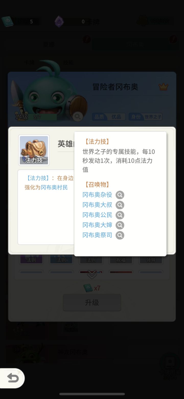 因为目前第一个赛季是冈布奥赛季,我们就主要以冈布奥世界之子的卡牌进行讲解。首先如图1,每个世界之子都有一个独特的法力技,每10s发动一次,每次发动消耗10法力值,像咱们的冈布奥世界之子的法力技就是在自己身边召唤一个冈布奥杂役,还可以随机强化成其他冈布奥村民。卡牌总共分为三种,分别是随从卡、支援卡(法术卡)、武器卡,如图2、图3、图4。