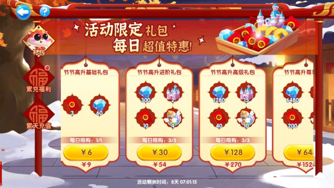 新春特惠礼包随节日到来,涵盖多重道具福利!累充达一定档位更有新春专属背景自选礼包等候领取~