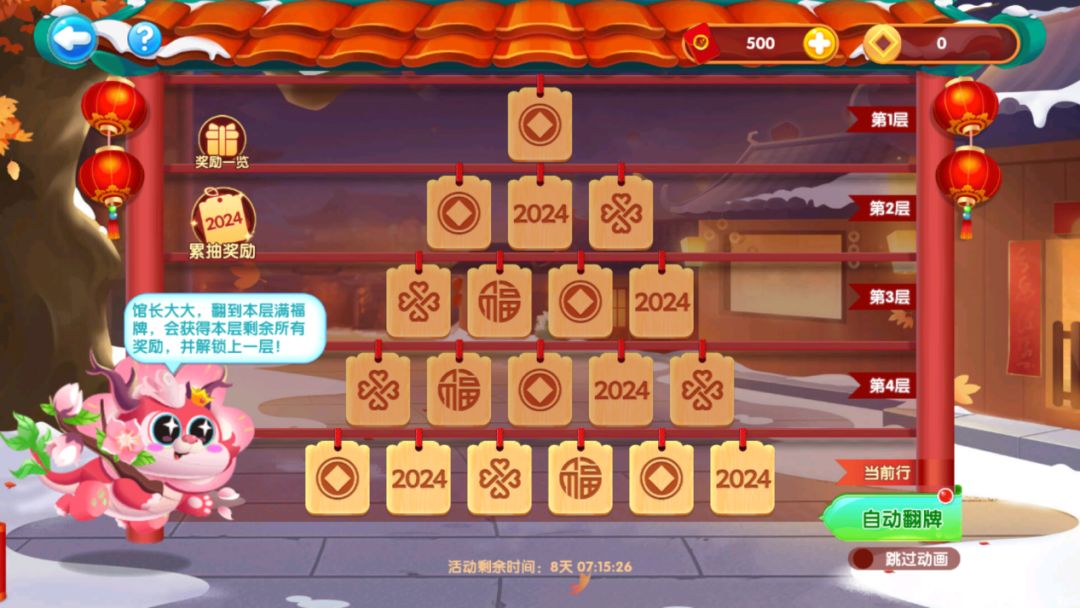 活动期间,消耗【福气红包】可在节节高升中翻牌领取奖励,翻牌顺序为从下至上,翻出本层满福牌可获得当前层数剩余的所有奖励,当翻出顶层至尊满福牌可获得活动新鱼“红火龙”并重置奖池~