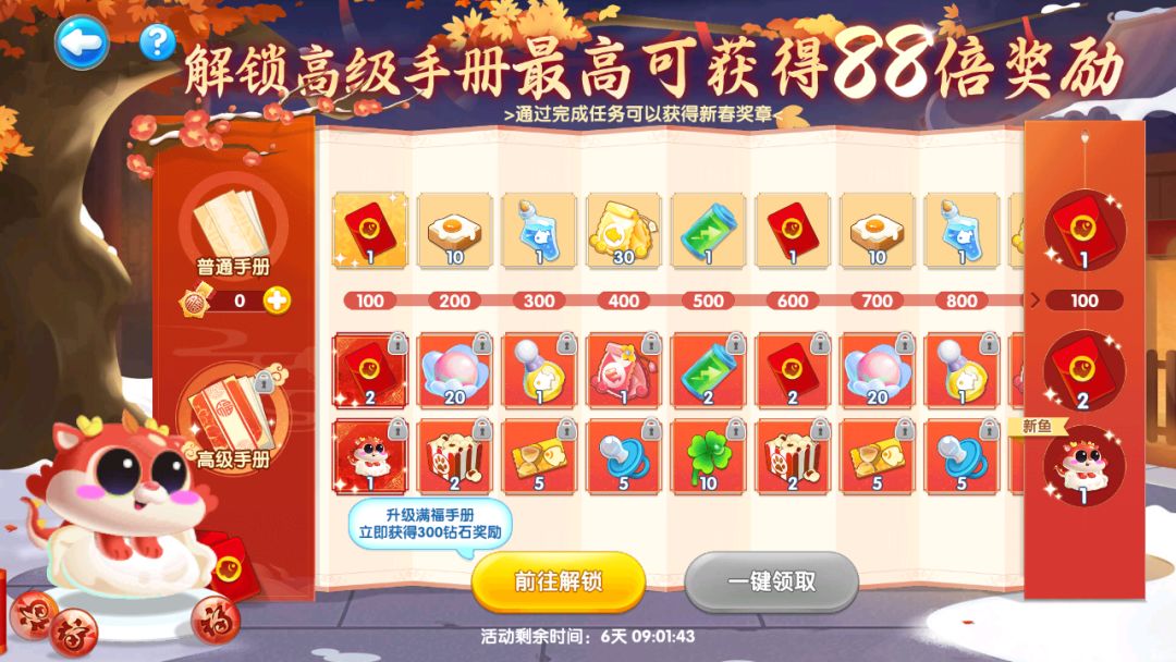 完成活动任务的馆长可使用新春奖章开启手册奖励啦!解锁高级手册还可立即获得300钻石,新鱼返场鱼都可带回家~