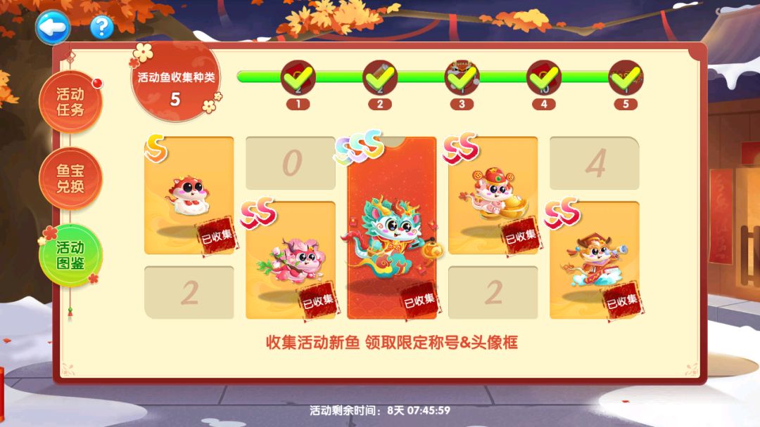 活动图鉴-收集活动萌鱼种类,点亮新春图鉴即可领取“念念有鱼”限定称号自选礼包和“龙吟新春”头像框奖励~