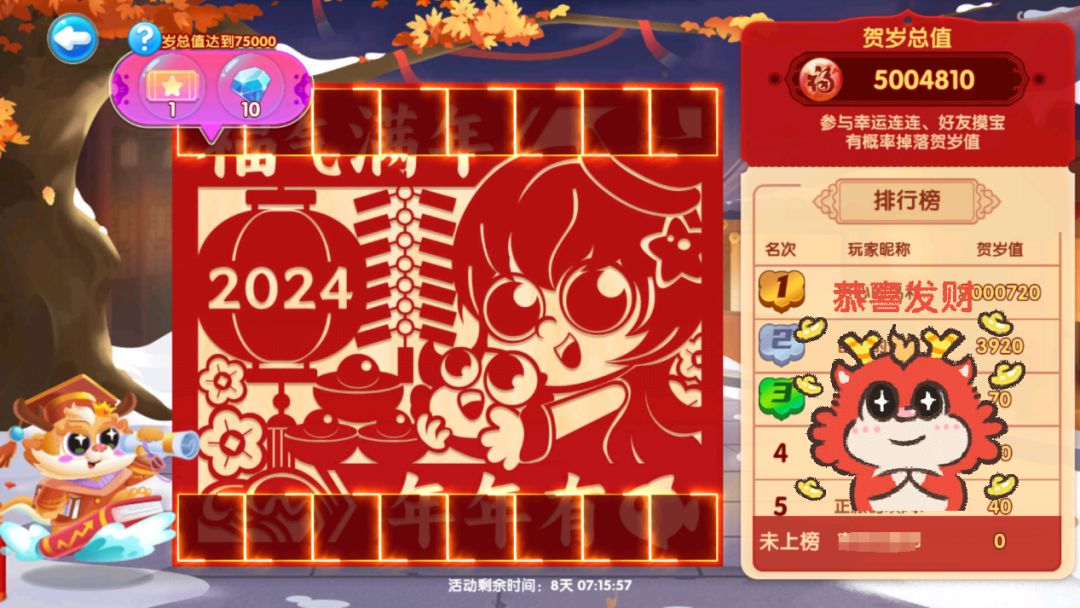 通过幸运连连、好友摸宝获得的贺岁值,可参与集福剪纸点亮方格,可领取扭蛋券、钻石等奖励,还能参与贺岁值排行比拼!比拼运气,比拼实力,在欢笑中收获满满的福气~