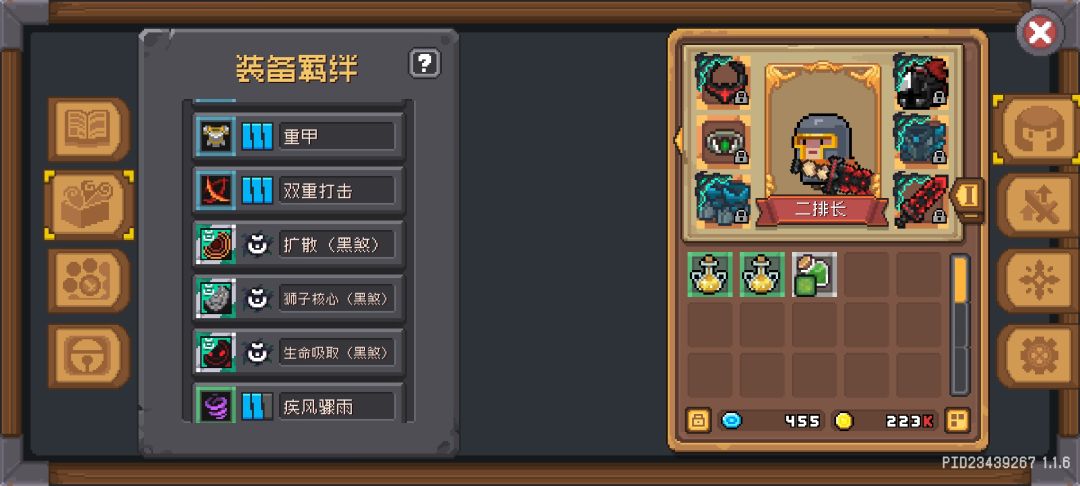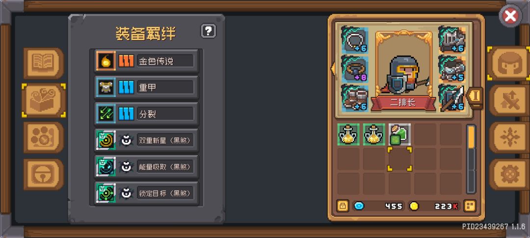 差多少呢?差点回复。也就是回血回蓝。这就要靠第三条羁绊了,这个赛季有黑煞系统,简单来说就是装备强化,可以在广场找到苗族婆婆,给装备强化。强化我觉得就分两种,一种是羁绊强化,强化后单羁绊拥有普通双羁绊的效果再+debuff(忽略不计);另一种就是单纯的词条强化,大强化,神化,异变(注意这个会变成其他装备)。所以我们可以给第三羁绊是生命吸取和能量吸取的装备注煞,前期普通注煞就行了,结晶留着开巅峰。注意,这个注煞到羁绊强化时候它是会在第二第三条羁绊随机注煞的,不一定是你要的第三条,而第一条是固定的,不用担心,只能看脸了