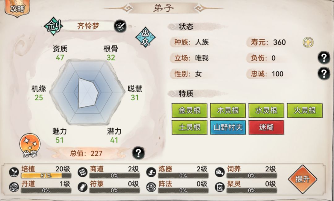 个人建议再培养一个五行剑,专用于打五行圣殿。只要是紫色品质以上,有五个灵根的剑修弟子都可以培养。关于天命,虽然可以通过九转金丹升阶带来,但不用过于追求,重点是潜力越高越好,如果有五行之体体质就完美了。不管追不追求天命,前期的时候都可以尽量升级天命。如果以后有更好的弟子,可以通过传功的方式返还天命。