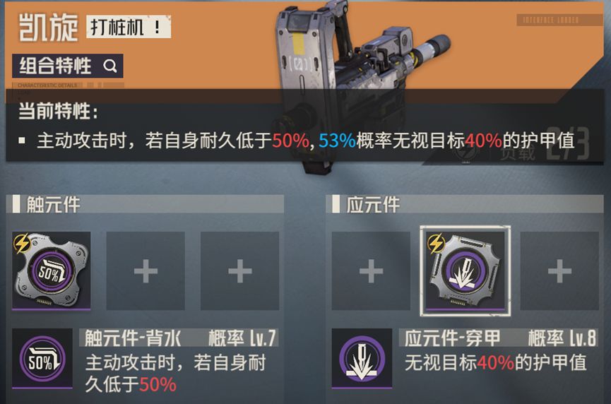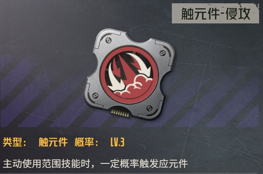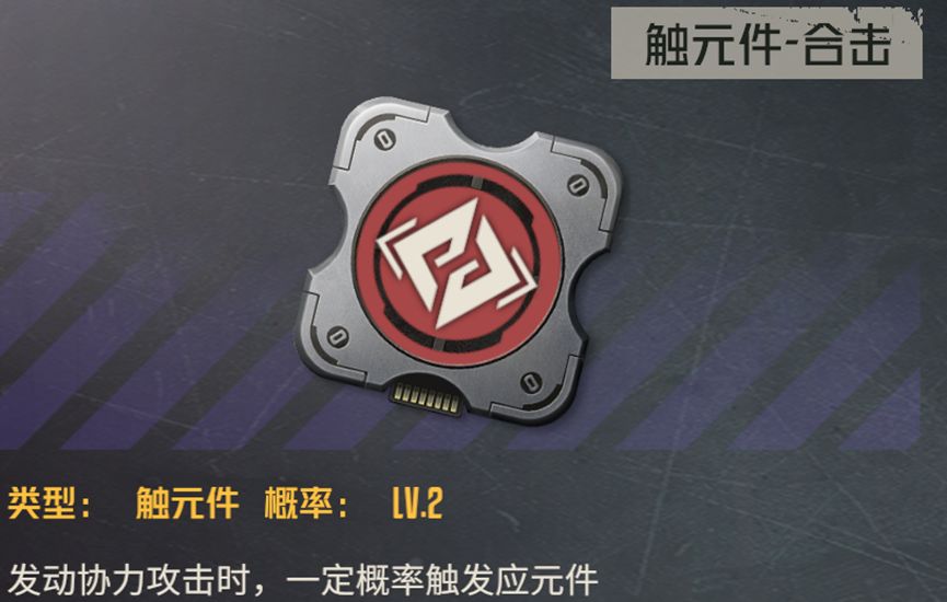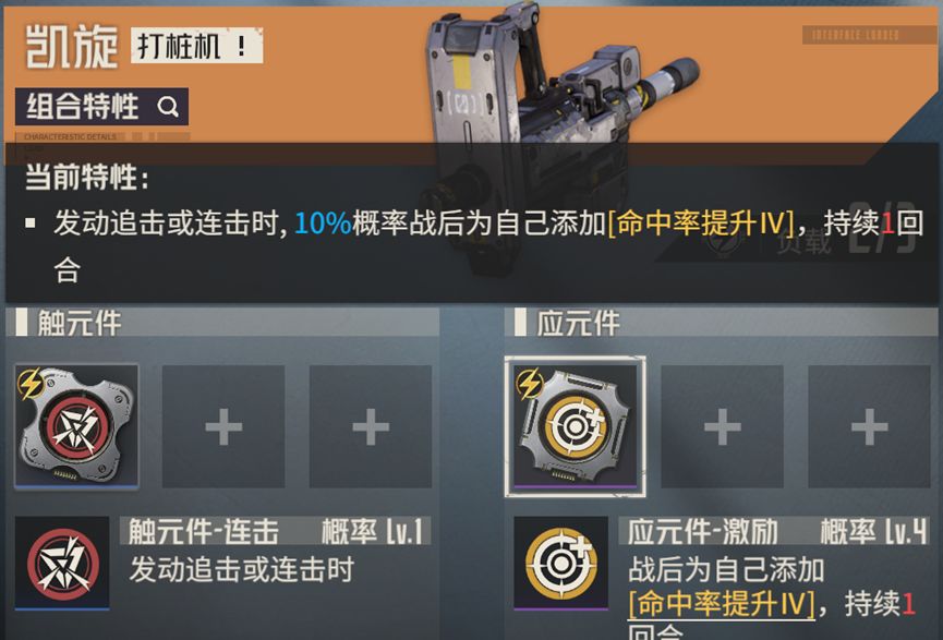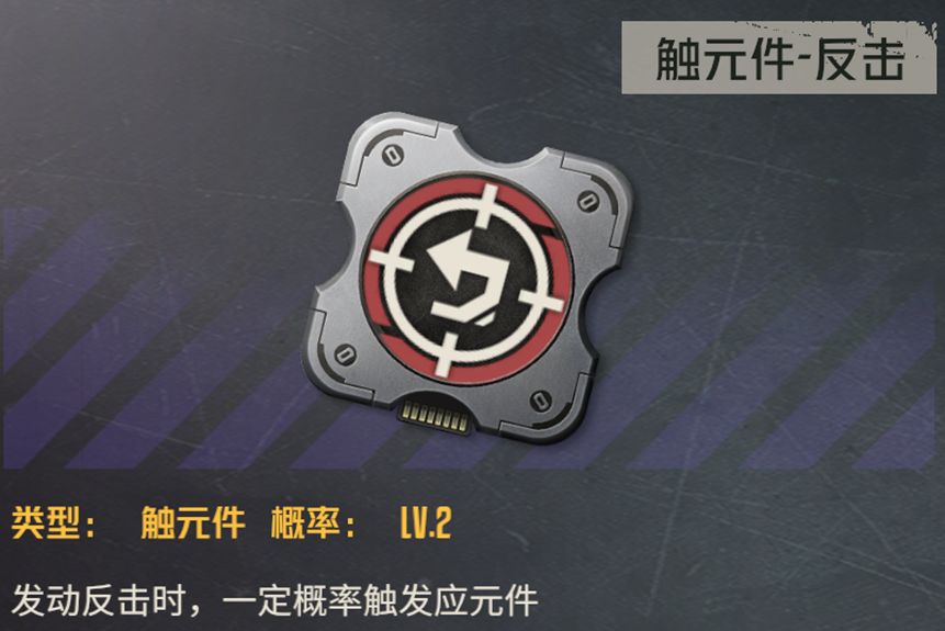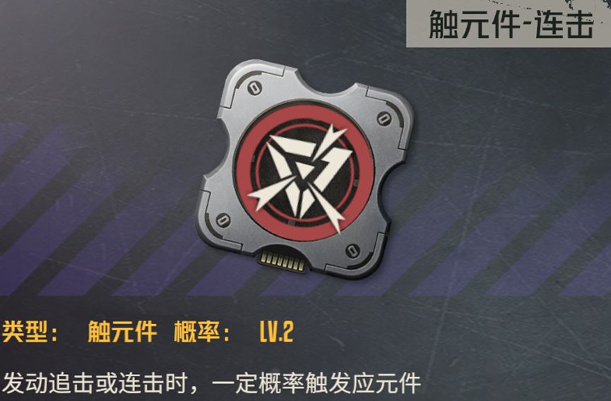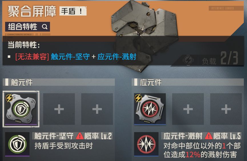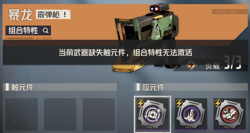 特性元件系统种,共有两种,分别是触元件和应元件,武器特性由它们共同决定,触元件决定特性的触发条件,应元件决定特性的具体效果。在当前版本中,一把武器共有三个元件负载,每个元件占用一个负载,也就是说总共可以装配三个元件,而为了特性能够触发,两种元件都需要至少装配一个。