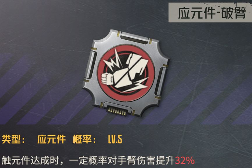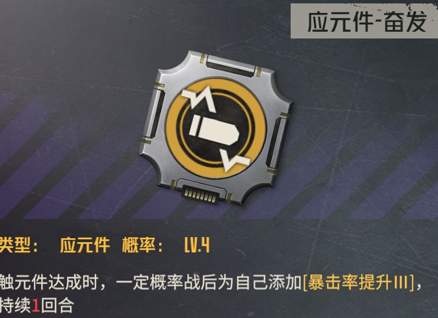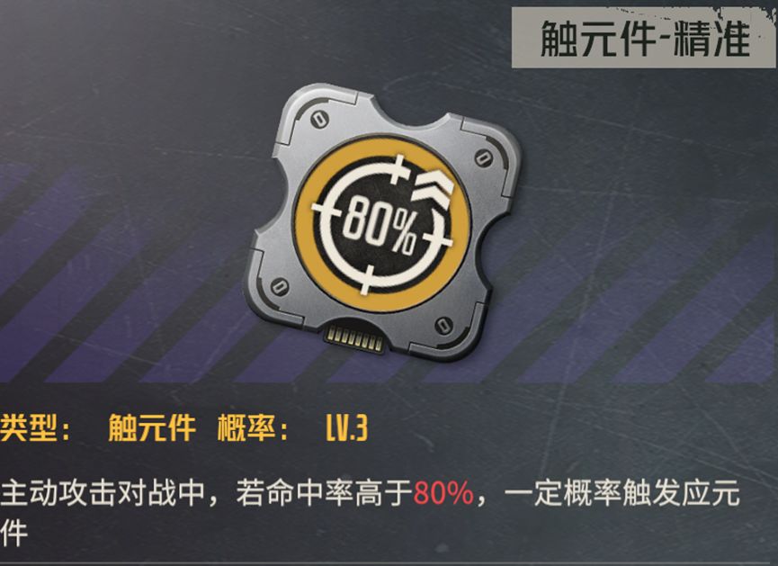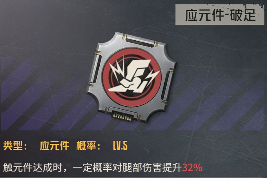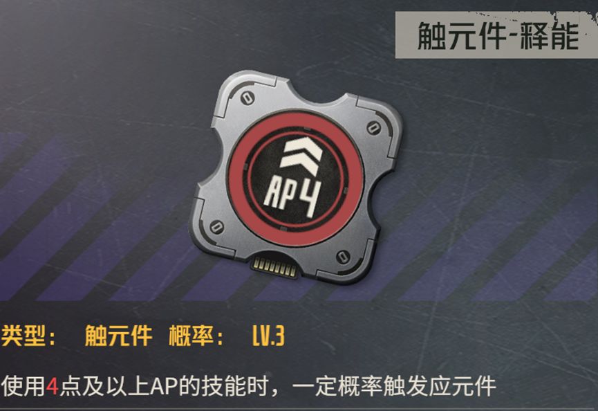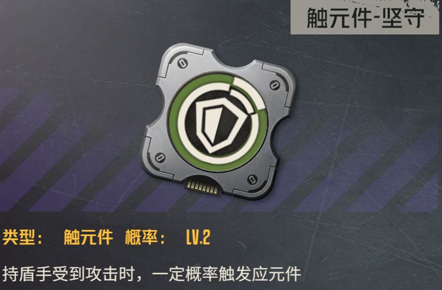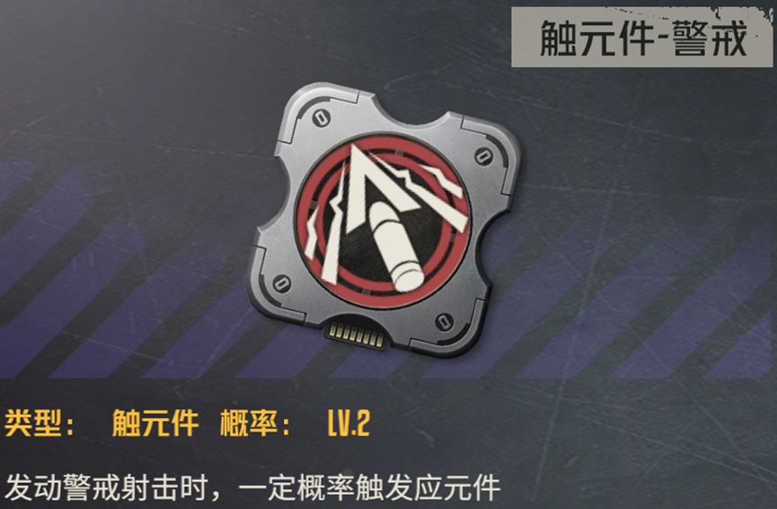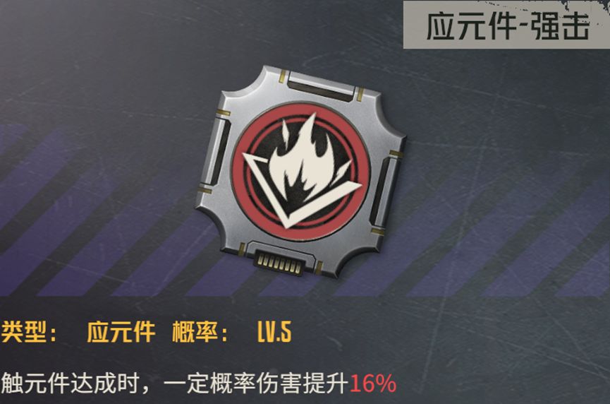 特性元件系统种,共有两种,分别是触元件和应元件,武器特性由它们共同决定,触元件决定特性的触发条件,应元件决定特性的具体效果。在当前版本中,一把武器共有三个元件负载,每个元件占用一个负载,也就是说总共可以装配三个元件,而为了特性能够触发,两种元件都需要至少装配一个。