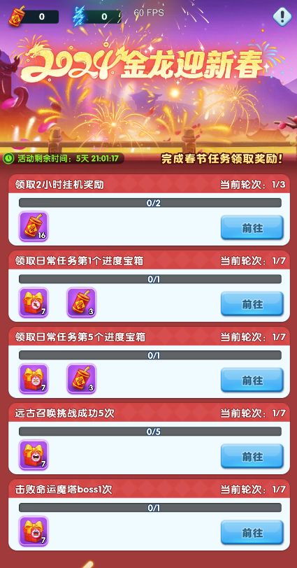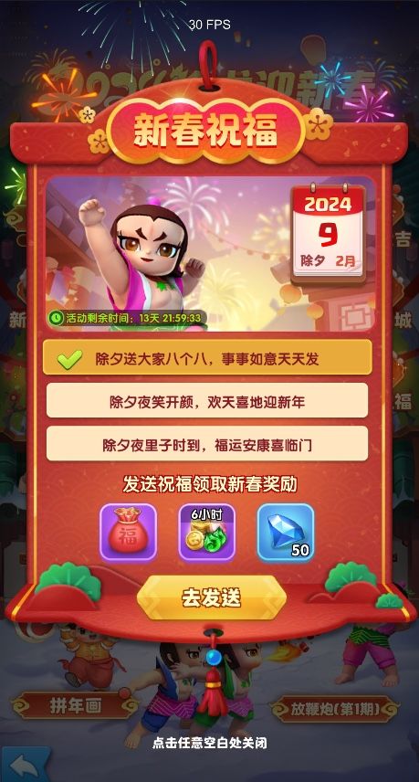 9. 新春任务:活动期间,完成任务可获得新春爆竹,使用可增加放鞭炮的进度获得奖励。
