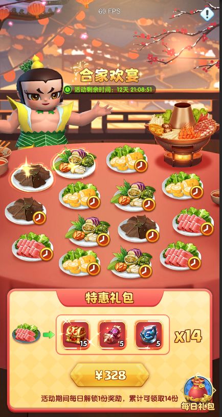 13. 合家欢宴:活动期间,每日解锁一份奖励,购买后可以在活动期间累积获得14份奖励。
