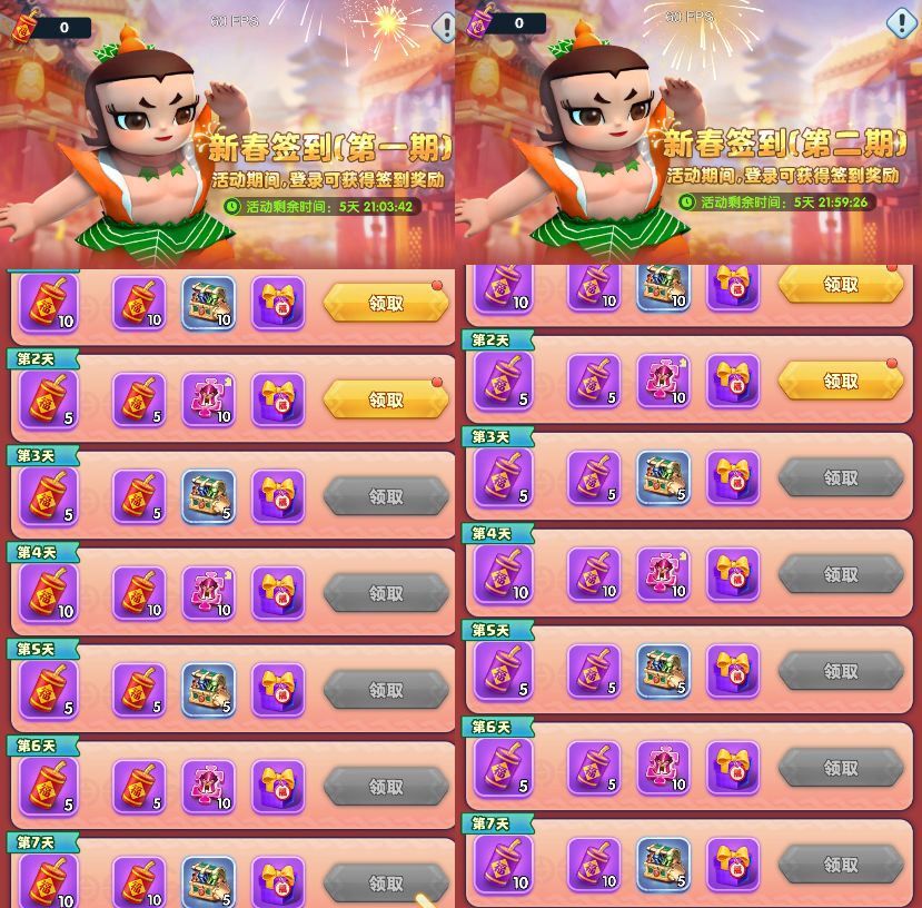 本次以下活动内容分两期开放:【放鞭炮】、【新春签到】、【新春任务】、【新春周卡】、【新春特惠】、【新春好礼】