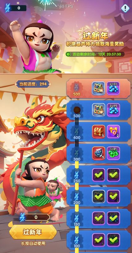 17. 过新年:活动期间,使用葫芦神力可增加过新年的进度,完成对应阶段时可以获得阶段奖励,达到最高进度后,可以增加葫闹好礼的进度。