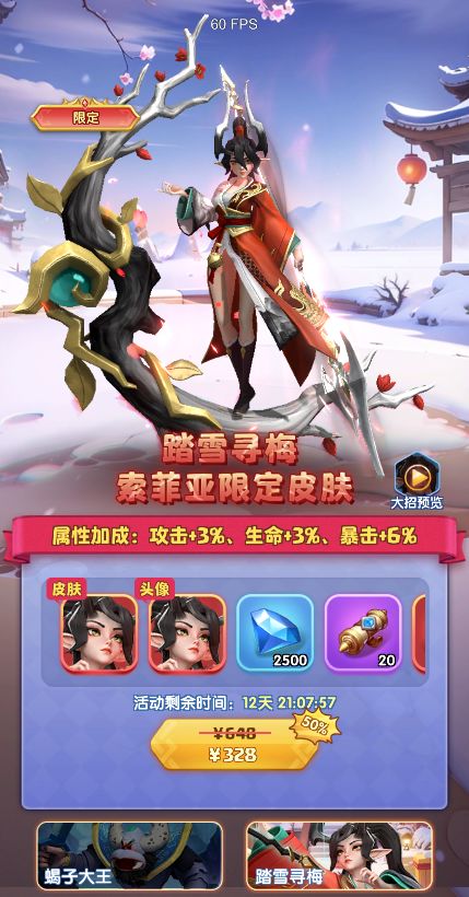 20. 新春皮肤:活动期间,开放索菲亚"踏雪寻梅"新春皮肤的购买。