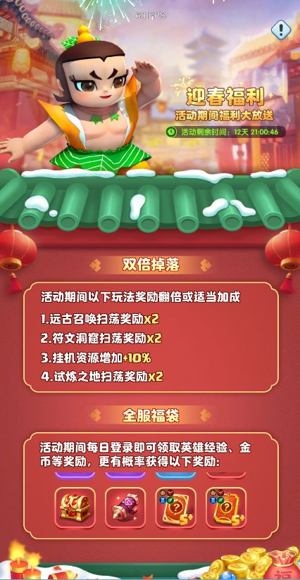 8. 全服福袋:活动期间每日0点~22点可领取一份新春福袋奖励,有概率开出惊喜大奖。双倍掉落:活动期间,玩家可享受远古召唤、符文洞窟、试炼之地副本扫荡奖励翻倍,挂机资源增加的特权。