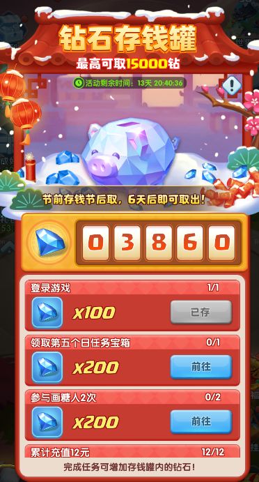 18. 新春存钱罐:活动分为两个阶段。第一阶段,旅行者可通过完成活动任务并存入钻石,最高可累积存入15000钻。第二阶段,旅行者可通过活动将存入的钻石取出。所以在一阶段存入的钻石越多,后面取出的钻石也就越多!