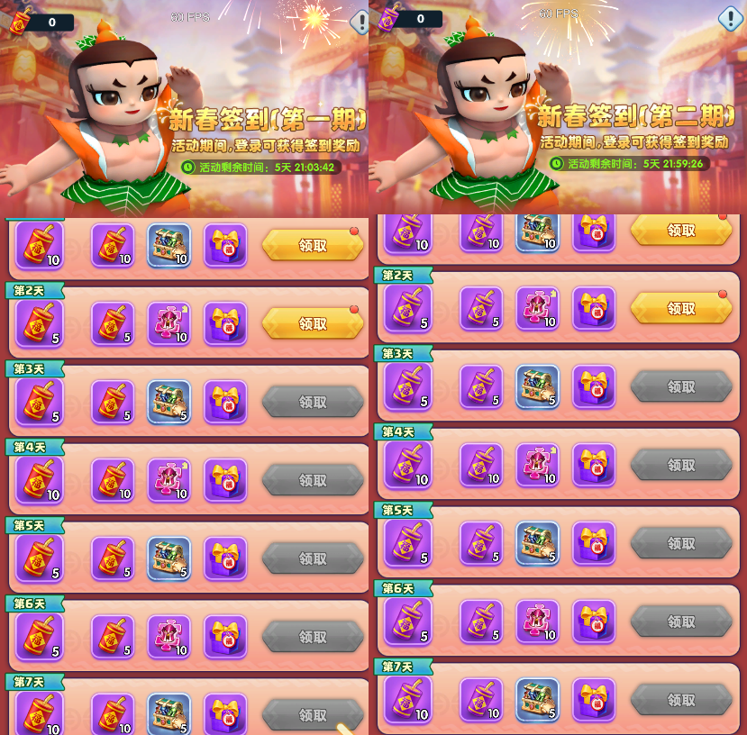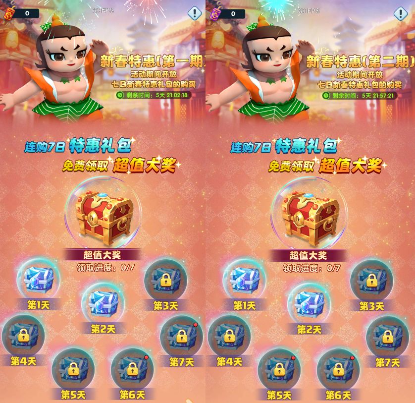 6. 新春特惠:活动期间,每天解锁一份特惠礼包,七日全购可领取免费大奖。