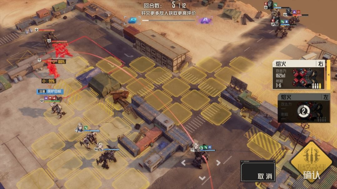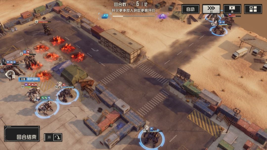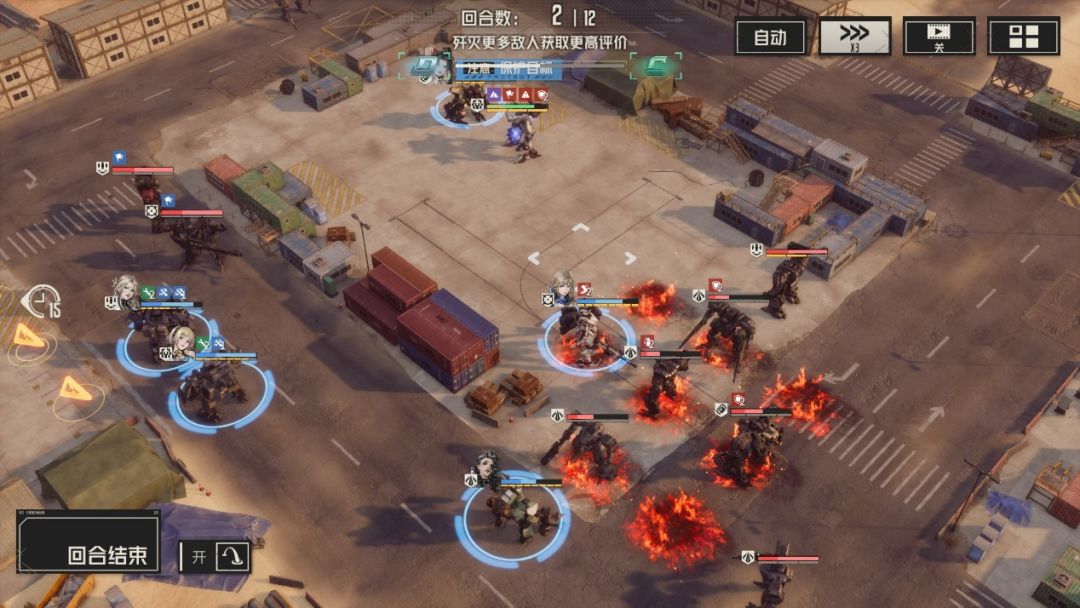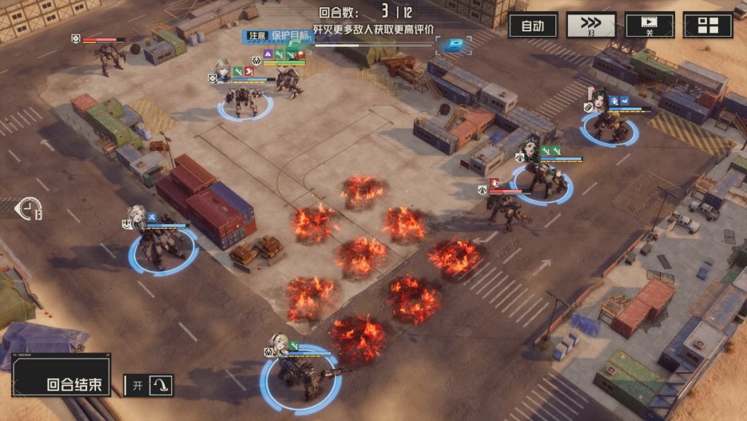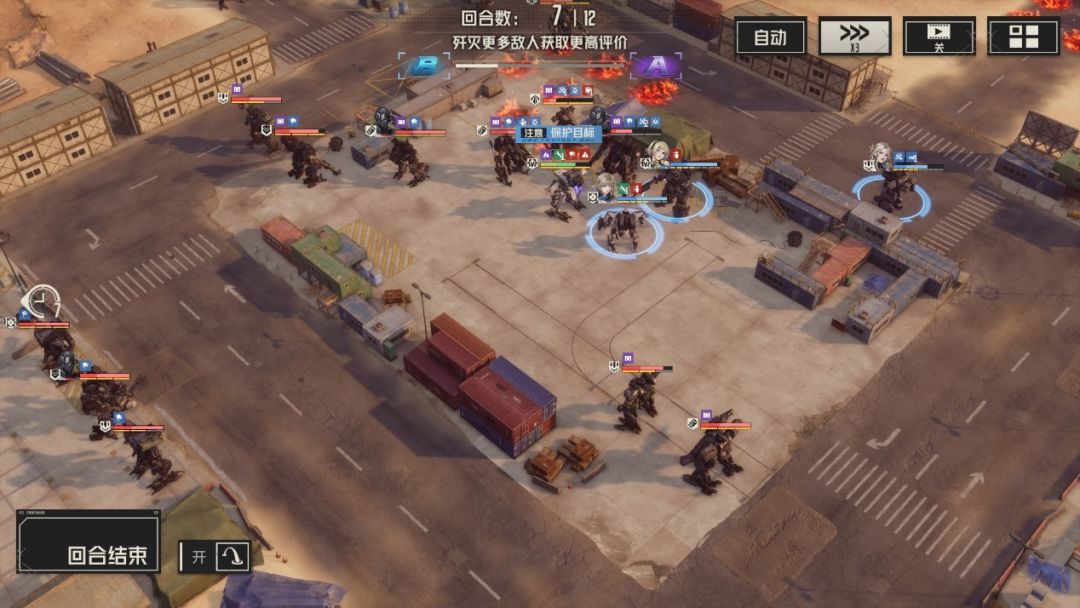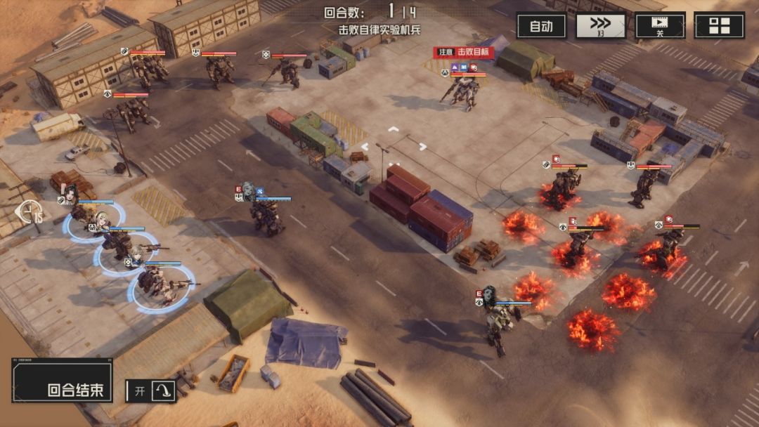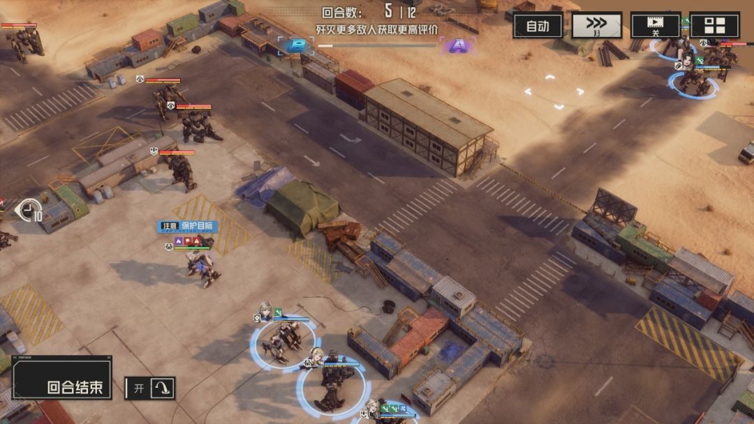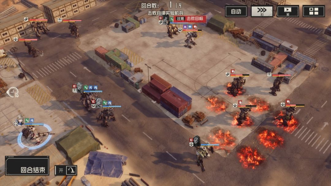 本副本我们采用分兵两路的策略,三人在下方消灭敌人,两人去上方与讨伐boss。前面第一阶段击败自律机兵较为简单,利用再动和远程攻击争取第一回合将其消灭,同时分兵,两人靠右走,前往上方boss处,其余三人原地防守。具体的防守策略则是火箭压低血线,其余人补刀,能消灭则直接消灭,不能消灭则破坏武器手或者腿部,一旦敌人获得躯干不屈能力,那么就不要再攻击躯干了,即使能消灭,也需要两次攻击,还无法再动,极大影响效率。而对于分去与boss战斗的两人,首要任务是赶路,尽快到达boss处,不要与路上其他敌人纠缠。
