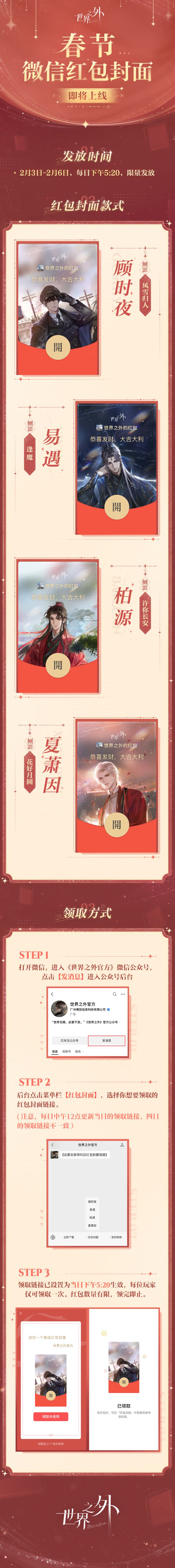 本次共计发放四款红包封面,分别为顾时夜-风雪归人、易遇-逢魔、柏源-许你长安、夏萧因-花好月圆。