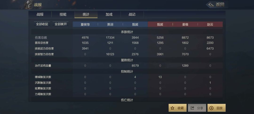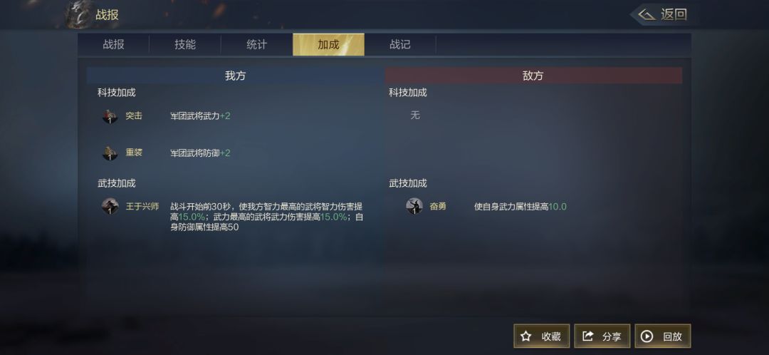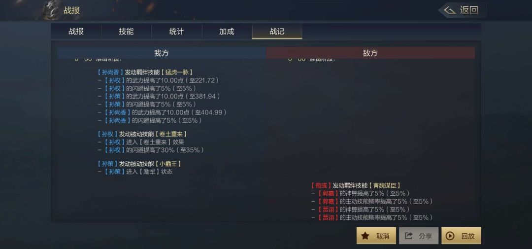 战记界面就是我们的重头戏。战记界面就显得有点复杂,但信息反馈的效果是最直面的,首先,看战报的目的就是为了获得信息反馈,那么你肯定不能错过战记,战记左边为我方状态,右边为敌方状态,在战记界面,我们可以得到我们的技能实际伤害,我们的战法发动顺序,我们的技能伤害目标,我们技能伤害造成伤害时有没有触发神算、暴击,我们的控制效果在战斗中的具体目标和敌方是否反制等等,这些都是其他界面不能给予你的信息,你只有通过战记界面进行研究,收集战记反馈的信息进行调整,这样才可以使自己立于不败之地。最后提一点这个回放功能。