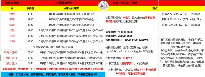 注:长枪装备默认为弑神枪+血甲,将魂选择:雨>神诸葛>风>>>大乔,赵云等。