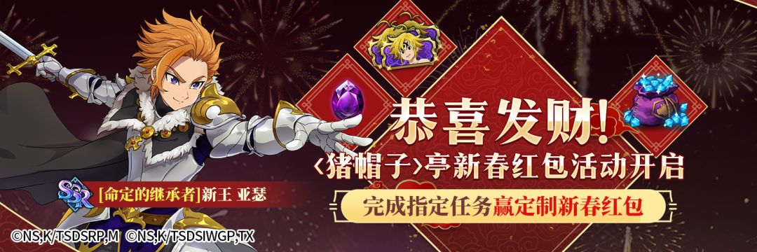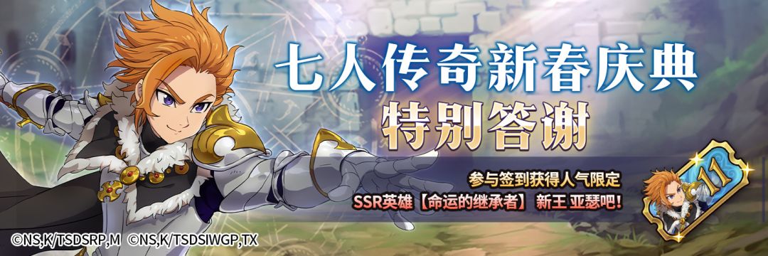 活动介绍:活动期间内参与签到,领新春庆典抽奖券×50+钻石×150+新SSR英雄【命定的继承者】新王 亚瑟×1的丰富奖励!