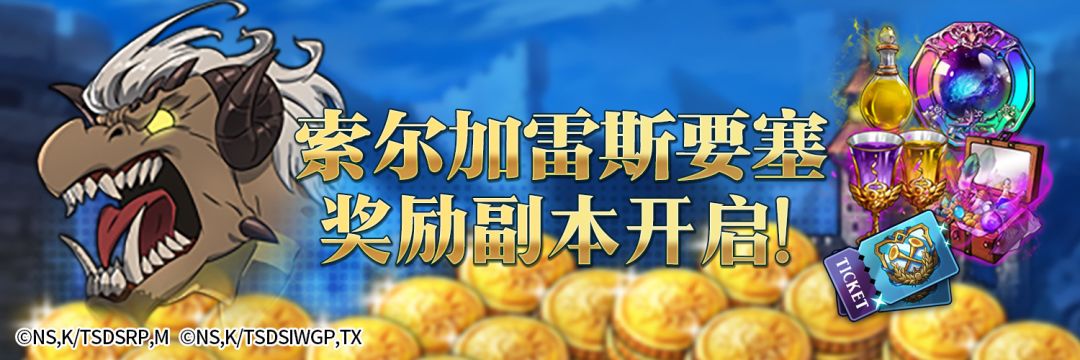 活动介绍:为了庆祝新春庆典,索尔加雷斯要塞出现了奖励副本!每日通关1次即可获得超觉醒币、6星英雄强化药水、UR宝物箱等材料,另外还可获得红色魔神的角、灰色魔神的翅膀、魔兽哈乌列斯的耳朵等珍稀养成奖励;入口处在索尔加雷斯要塞的活动界面,请速速前往吧!