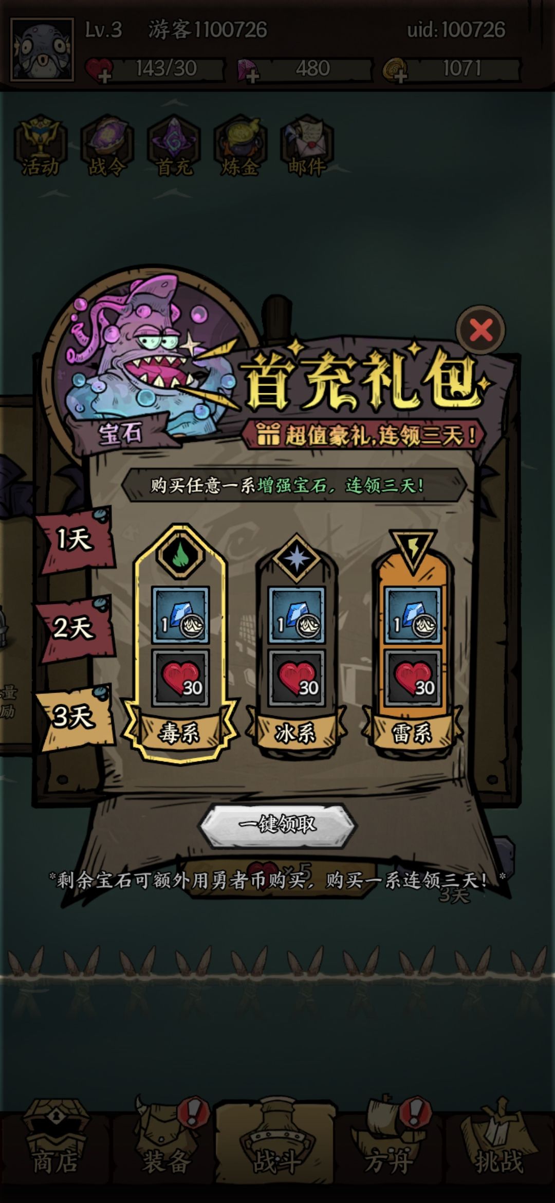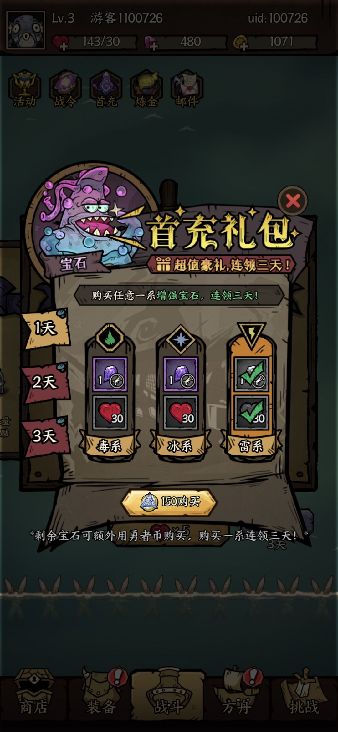 说下充值吧,有个首冲第一次随机领取,毒,冰,电,符文,这个可以替换普攻大炮,后面就有个150也就是15块钱的充值货币购买符文,我这试了2号号,都是搞了首冲都是冰属性的,估计是固定了,行为毒符文牛逼,让你后面继续氪15块购买吧,好的说完这个再说一下首冲3天都有奖励领取,第二天就是对应的符文加成符文了,也是同上面的毒,冰,电。也是随机,估计也是要钱自选那种