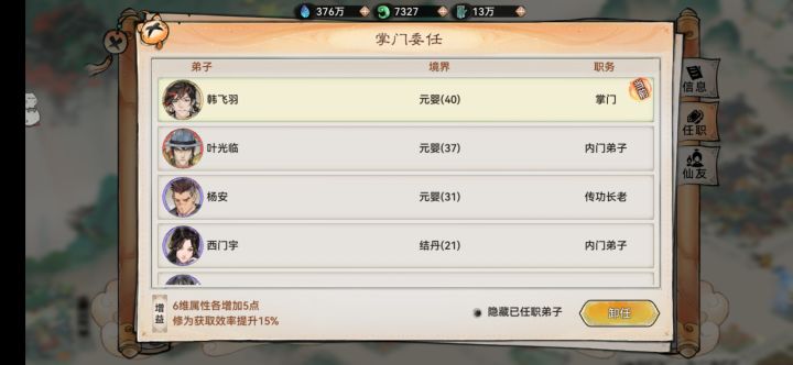 小伙伴角色升级主要靠吃丹药,把要升级的角色任命为掌门,可以增加修为获取效率,后期经验暴涨的情况下还是很可观的